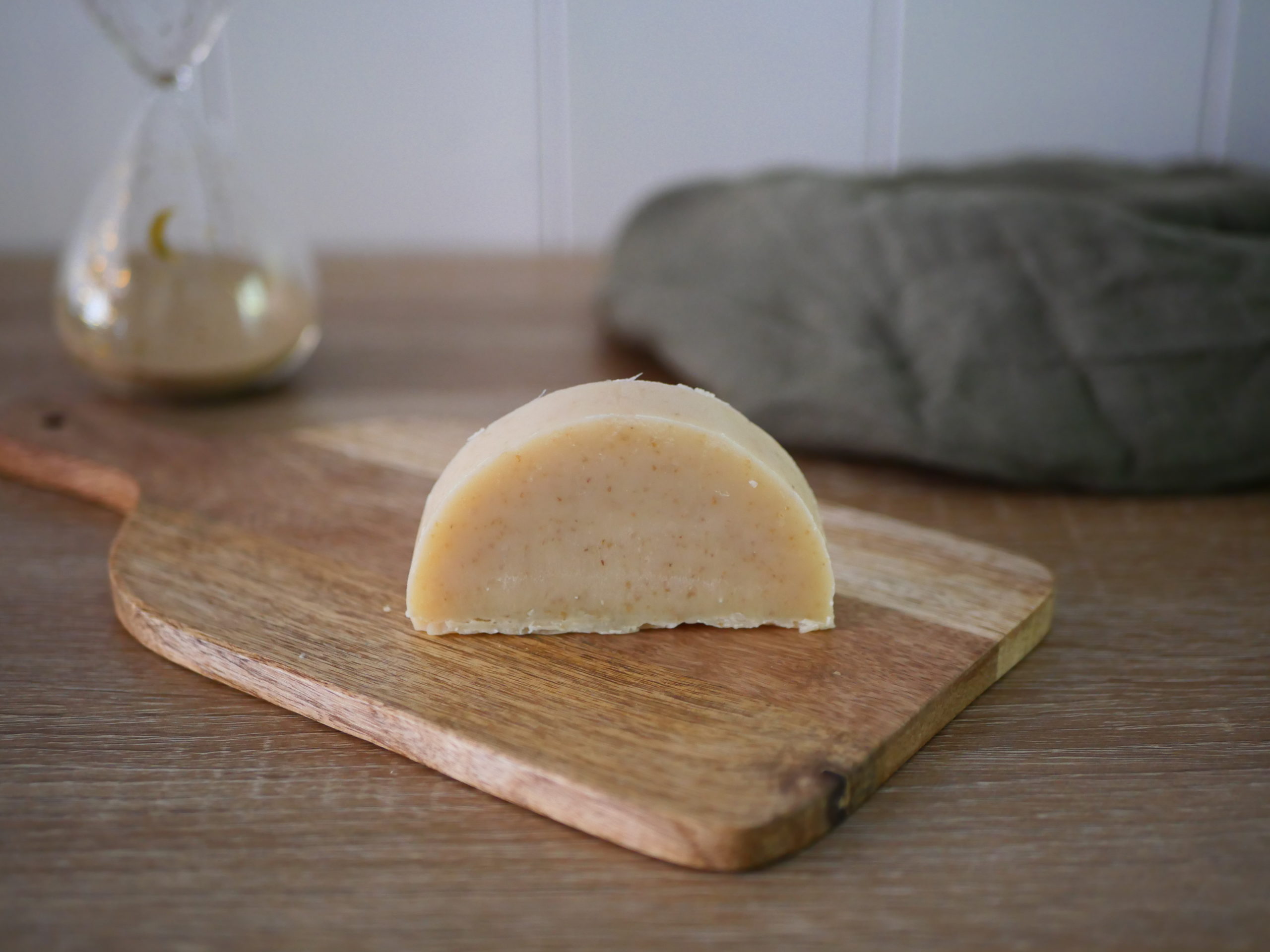 Ingrédients : beurre de karité* saponifié, huile de coco* saponifiée, huiles de ricin*, brocoli* et tournesol* saponifiées, bière*, poudre d’avoine* huiles essentielles de lavandin grosso*, orange douce* et tea tree*.